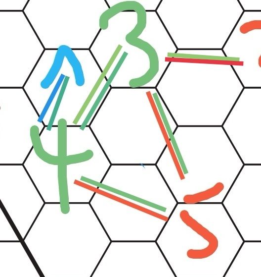 - Hat ein Geländemarker mit zwei oder mehr Verbindungen die Möglichkeit, eine Verbindung zu einem benachbarten (Groß)Hexfeld herzustellen, dann muss es dies tun.