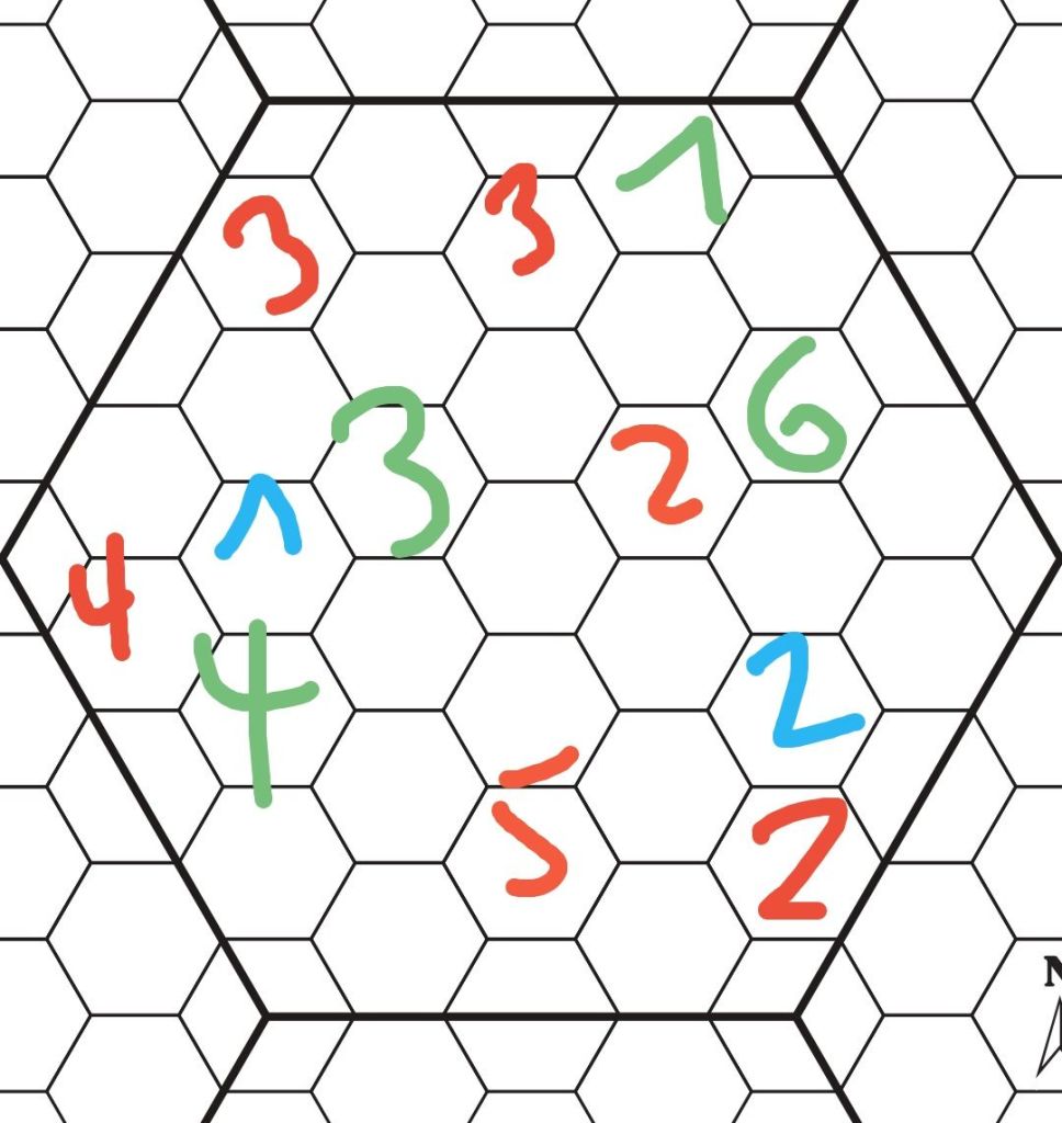 - Hingegen wäre ein Marker mit W8 Verbindungen womöglich sehr zentral im Hexfeld oder sehr populär und wichtig, zb. eine wichtige Stadt, Handelsposten usw. Beispiel: ein blauer Würfel zeigt die „8“. Eine mächtige Stadt liegt an den Ufern des Stroms und kann sowohl über Wasser als auch über Landwege erreicht werden.