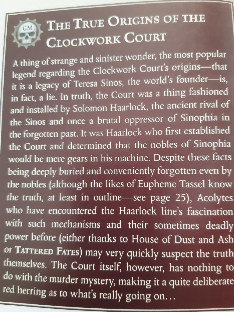 „Those who enter the court are waited on by clockwork creatures fashioned in the form of angels and heroes from Imperial history. There are thirty-seven ‘servants’ in the court. When not attending to visitors, they stand all but motionless, silently watching those who enter, following them with jewelled eyes. Legendary on Sinophia, these are no mere servitors, for they contain no fl esh. Each is a wonder of glittering brass, charged copper, and brushed steel, their movements pulsing with soft clicks and whirs. The floor of the court is transparent and reveals the vast whirling mechanism beneath that powers and controls the servants. The workings of the court’s mechanism are a mystery, and it has run without fail since the world’s foundation. Some whisper that the Clockwork Court controls some ancient secret—a legacy of the Rogue Trader Teresa Sinos.„