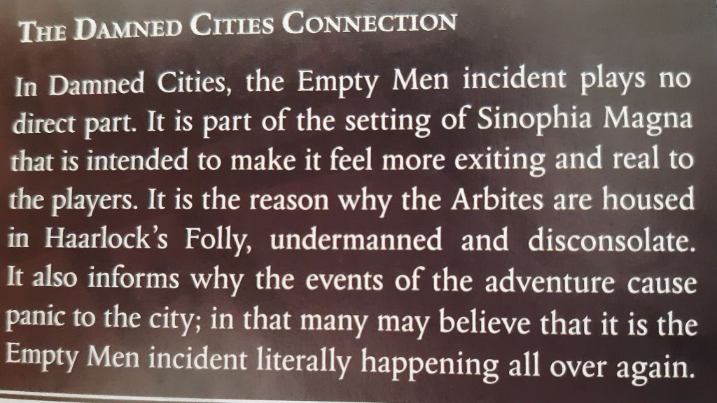 Alles nicht ganz so, wie ich es mir wünschen würde, Informationen muss man manchmal in Fließtexten suchen- generell ist der Schreibstil sehr sparfällig und man hätte viel mehr Inhalt hier unterbringen können, stattdessen viel Flavour den man als Spielleiter vielleicht gar nicht braucht. Die abenteuerstruktur versucht über einen gewissen Zeitraum die Ereignisse abzuhandeln, dabei sind die Aktionen des Antagonisten sowie der Überlebenden Ziele wenn überhaupt nur grob skizziert, hier hätte man mehr rausholen und dem Spielleiter an die Hand geben können. Das Buch hat ungefähr 70 Seiten Text, davon fallen für das eigentliche Abenteuer 23 Seiten ab, der Rest ist Hintergrund, Überblick der Welt, Anhang etc. Gemessen an der Anzahl an Möglichkeiten innerhalb des Abenteuers, aber auch der Anzahl an potentiellen Akteuren bekommt man hier eher ein Skelett und wenig Fleisch.