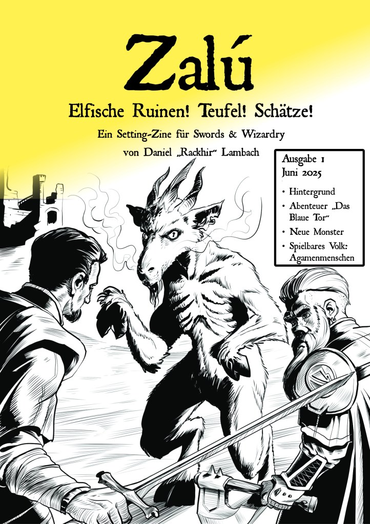 Über die Welt von Zalú habe ich hier schon einiges geschrieben. Die Grundidee des Settings ist „Melniboné meets Event Horizon“ – eine elfische Metropole wurde in die Hölle gesogen und ist nach über einem Jahrtausend wieder da, voller Teufel, alter Schätze, verlorener Magie und düsteren Geheimnissen. Die SCs sind Glücksritter:innen und Schatzsucher:innen, die von einer nahegelegenen Oase ausgehend Expeditionen in die Ruinen der Elfenstadt Uyovu unternehmen. Geschrieben ist alles für Swords & Wizardry, aber es lässt sich natürlich leicht für andere OSR-Retroklone umbauen.