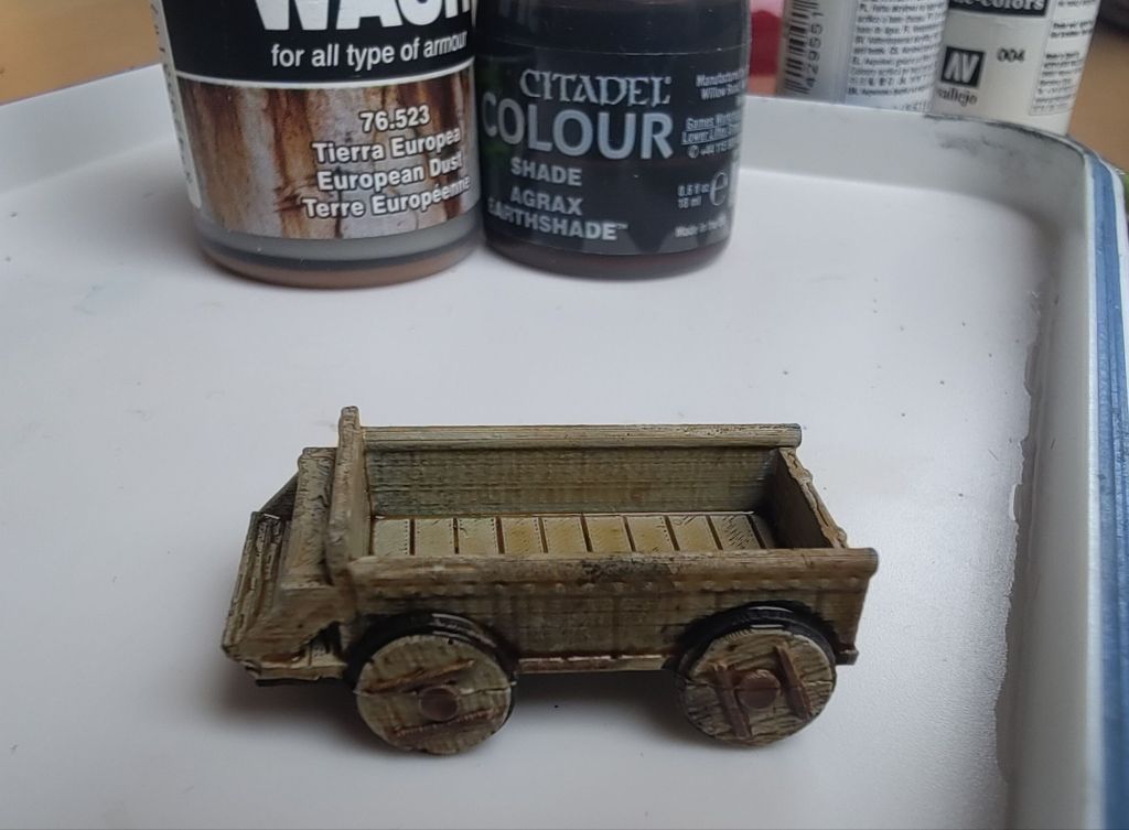 Die Holzmaserung und die Fugen zwischen den Planken der Ladefläche sind nun viel plastischer. Die zuvor gemalten Details an den Rädern sind durch das Speed Paint immer noch sichtbar, weil die Farbe kaum deckt. Je dunkler das Speed Paint, desto stärker decken die Farbtöne in der Regel. Mir war Pallid Bone aber etwas zu hell, darum habe ich noch eine weitere Farbe hinzugezogen, quasi die Vorgängertechnologie: einen dünnen Überzug („Wash“) namens Agrax Earthshade, im Prinzip was die Leute zum Herausarbeiten der Details genutzt haben, bevor es Speed Paints gab. Auch hier hab ich mit dem größeren Pinsel einmal alles großflächig überzogen. Auf dem Bild sieht man, dass dieser Wash sich nicht so schön gleichmäßig auf dem Modell setzt wie das Speed Paint. Nach der „alten Schule“ würde man die glatten Flächen, beispielsweise die Planken, anschließend wieder mit „normaler“ Farbe übermalen und dann nochmal nachschattieren. Weil das hier aber keine Miniatur für die Vitrine wird, sondern eine für den Tisch, ist mir das herzlich egal.