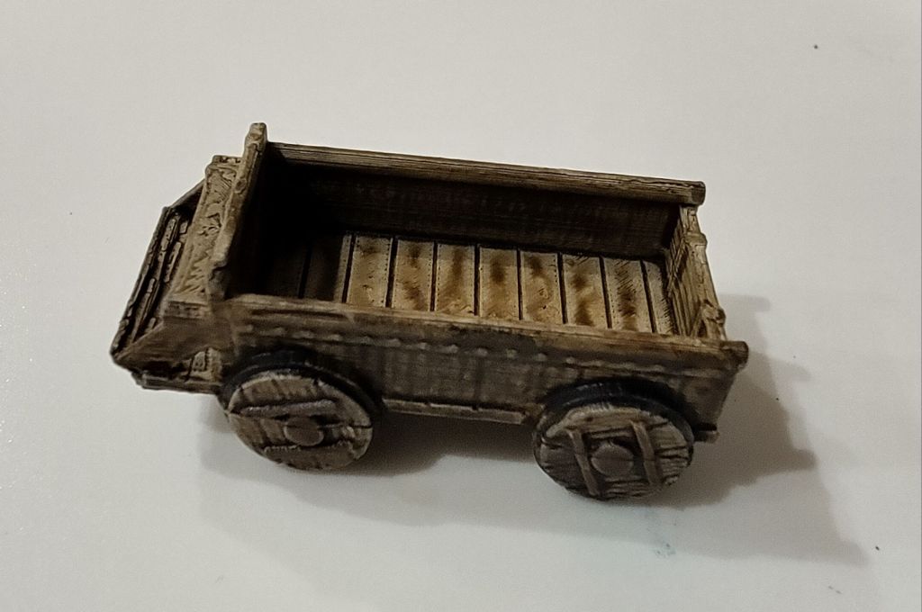 Ich habe im Herbst 2025 mit Pathfinder angefangen und das Spiel mit den Bodenplänen ist etwas, was mir daran viel Spaß bereitet. Für die üblichen Kämpfe greife ich auf die offiziellen Pappaufsteller zurück (die brauchen auch angenehm wenig Platz im eh schon vollen Regal), aber die Spielercharaktere bekommen modellierte Miniaturen. Und in diesem Fall – wir spielen die Königsmacher-Kampagne, eine waschechte Hex Crawl Sandbox der Marke Westmark – wollte ich auch einen hübschen Spielstein für die Gruppe auf der Weltkarte haben. Darum zeige ich an diesem Beispiel mal, wie ich diesen kleinen Wagen bemalt habe. Insgesamt hat es etwa 40 Minuten gedauert, aber ich hab mich auch nicht sonderlich beeilt und während einer längeren Trocknungszeit noch was anderes gemacht.