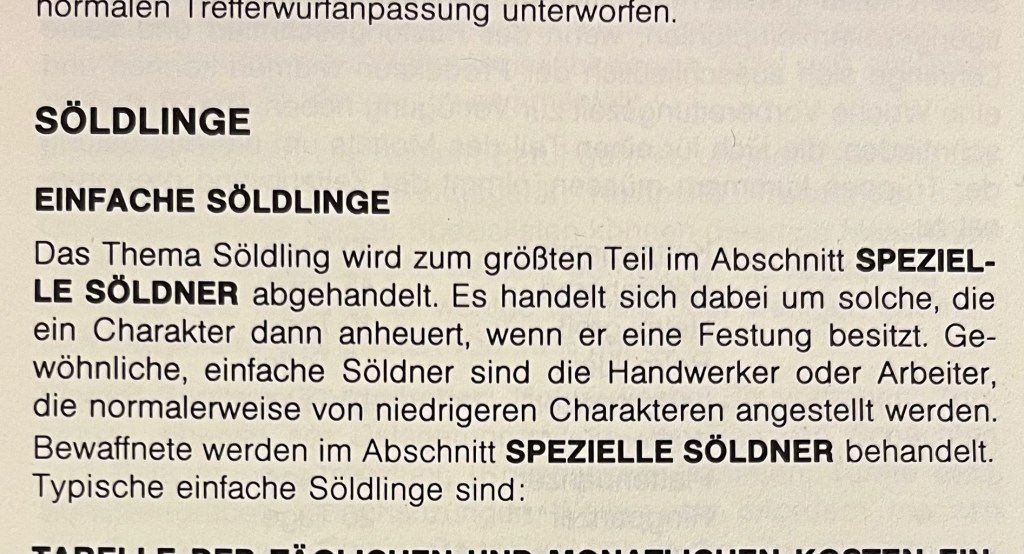 Der Spielleitung wird also empfohlen, die Gruppe auf Wunsch Verstärkung anwerben zu lassen. Im weiteren Text wird erläutert, wie das geschieht: Gruppenmitglieder bringen Aushänge in Wirtshäusern und Gasthöfen an, suchen Orte auf, an denen die gewünschten Mietlinge (der Begriffe fällt hier erstmals überhaupt!) anzutreffen sind oder senden sogar Boten in andere Länder, wo gesuchte Mietlinge zu finden sind.