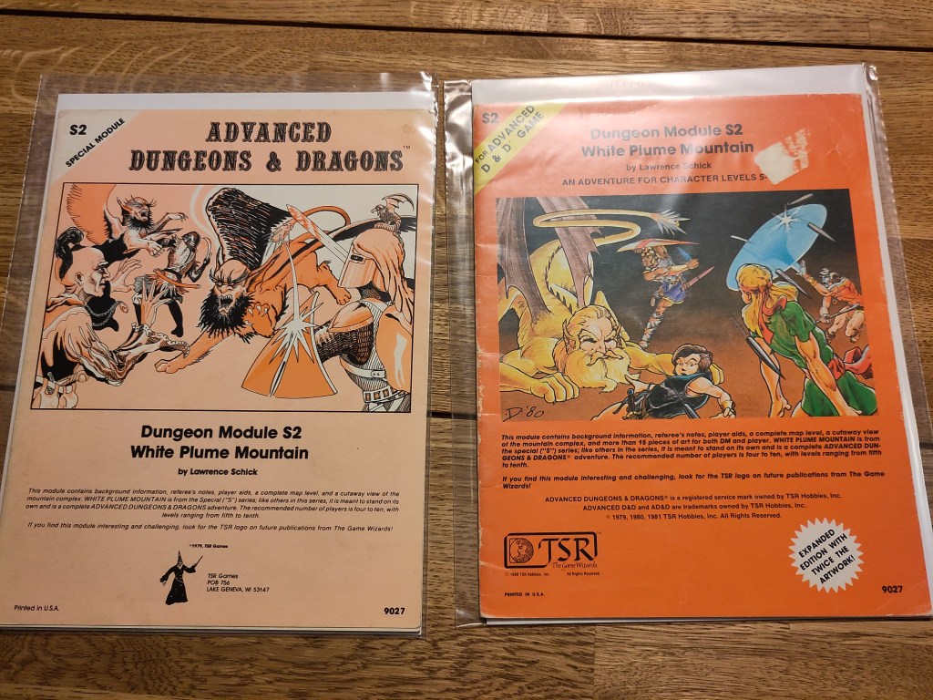 White Plume Mountain einmal monochrom, einmal vollfarbig. Das Abenteuer hat dem Autor Lawrence Schick einen Job bei TSR eingebracht. Das Artwork links ist von David C. Sutherland III, rechts von Jeff Dee.