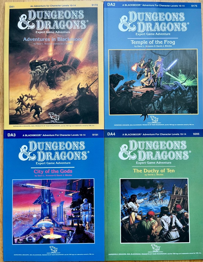 Ein paar weitere Basic-D&D-Abenteuer: Dieses Mal für sehr hochstufige Gruppen, der Umfang ist höher als bei den niedrigstufigen Abenteuern. Diese hier erschienen für das Blackmoor-Setting des D&D-Miterfinders Dave Arneson.