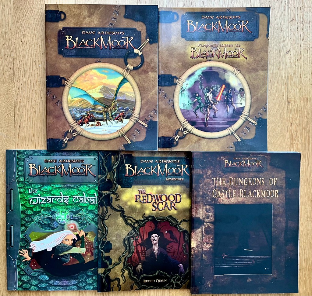 Auch der andere D&D-Miterfinder Dave Arneson wollte vom 3e-Kuchen mitnaschen: Oben einige der für sein Setting Blackmoor geschriebenen 3e-Setting- und Abenteuer-Bände. Auch diese sind im Vergleich zu den oben gezeigten Basic-D&D-Blackmoor-Abenteuern deutlich umfangreicher geworden.