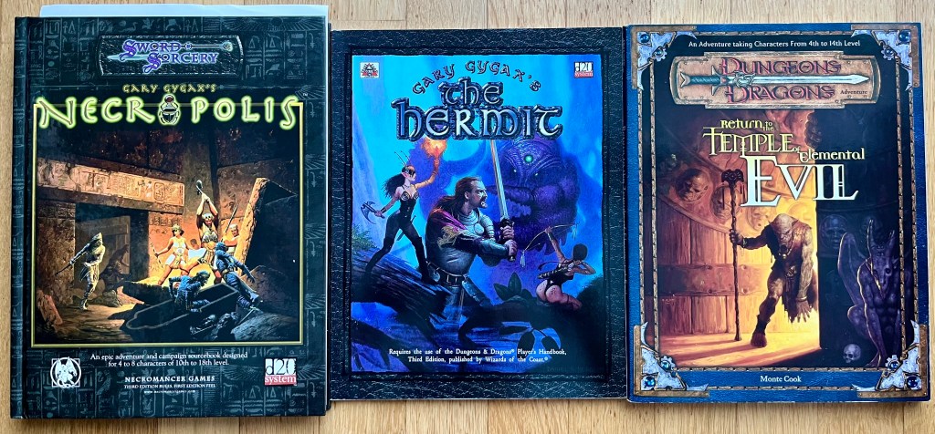 Hier sind ein paar 3e-Neuauflagen alter Gary-Gygax-Abenteuer: Die linken beiden über Drittanbieter, das rechte wurde von WotC auf Basis eines alten 1e-Original-AD&D-Abenteuers erstellt. Der angegebene Autor war nicht weniger als einer der 3e-Regeldesigner. So verwundert es nicht, dass der Anhang des Abenteuers einen halben Monsteranhang für 3e enthält.