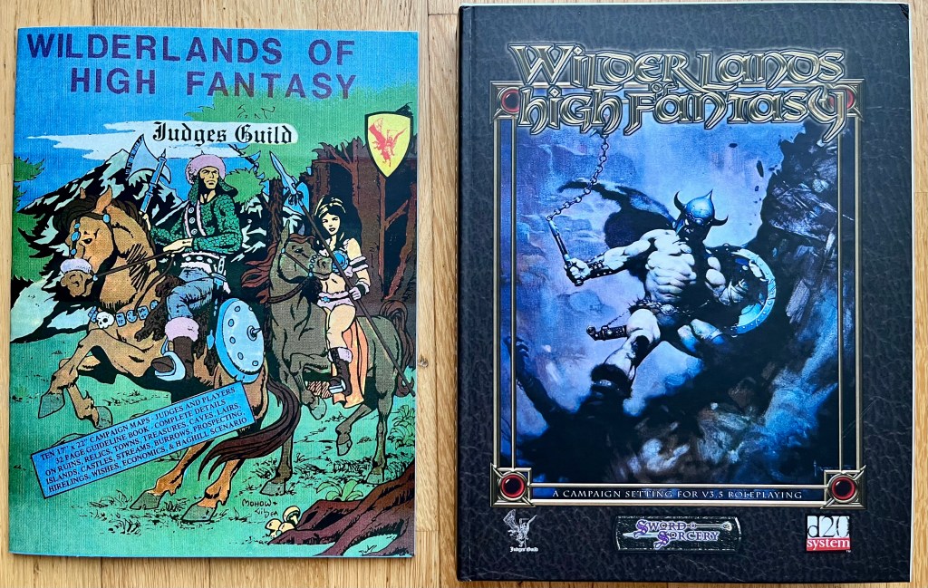 Ein etwas unfairer Vergleich: Links die Originalausgabe von Judges Guild’s Wilderlands of High Fantasy. Es beschrieb in einem dünnen Heft einen Kartenausschnitt eines großen Settings iHexfeld für Hexfeld. Insgesamt gab es 12 riesige Kartenausschnitte plus Extrahefte für bestimmte Schauplätze, v.a. Städte. Rechts die 3e-Version, die Anfang der 00er-Jahre als große Box für das gesamte Setting herauskam. Separat wurde nur noch der City State of the Invincible Overlord behandelt (s. weiter oben).