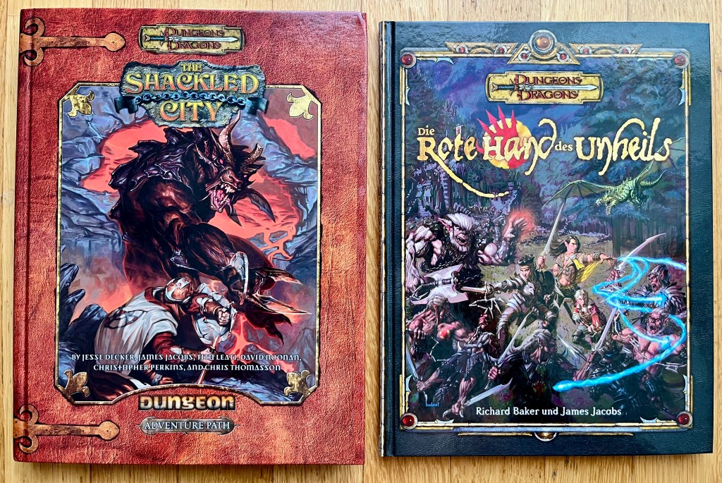 Zwei deutlich gewichtigere Abenteuer der 3e-Phase: Links der erste offizielle Abenteuerpfad von den Machern des Dungeon-Magazins (der offiziellen Abenteuerzeitschrift für D&D). Rechts nach Meinung vieler eine der besten für 3e erschienenen Kampagnen.