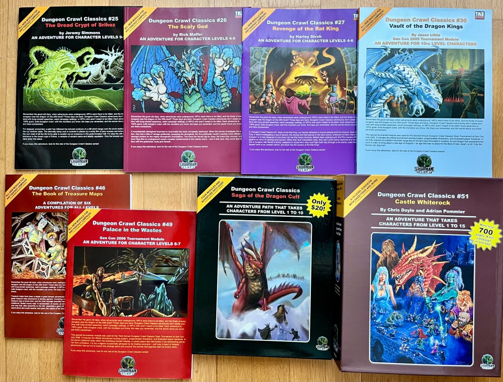 Hier sind einige DCC-D&D-3e-Abenteuer: Diese reichen von dünnen Heften (oben links) bis zu riesigen Boxen (unten rechts). Damals dürfte die Castle Whiterock-Box schon einen Umfang von etlichen hundert Seiten gehabt haben. Der jüngste Goodman-Games-Kickstarter für eine DCC-RPG-Neuversion dürfte dann wohl an der 1000-Seiten-Marke kratzen.