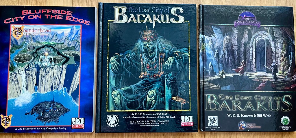 Einige Abenteuer, die keine Neuauflagen bekannter Klassiker sind, allerdings den alten Abenteuerstil in neuen Abenteuern nachahmen. Auch hier gibt es bereits Neuauflagen: In der Mitte die ursprüngliche 3e-Version von The Lost City of Barakus. Rechts ist die Neuversion für Swords & Wizardry.