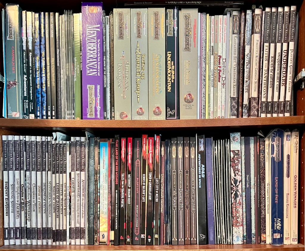 Die obere Regalreihe und die linke Hälfte der unteren Regalreihe zeigen meine kleine Forgotten Realms-Sammlung, die weit von vollständig ist! Sie spannt sich inzwischen von 1e bis 5e. Die unsauber aus den Bänden herausragenden Zettel sind ausgedruckte Weberweiterungen, die um die Jahrtausendwende übers Internet Extras für die Bände nachlieferten.