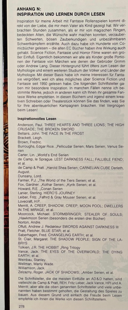 Der berühmte Anhang N des 1e-Handbuchs für Spielleiter von 1979. Ein kleiner Anhang mit großer Nachwirkung für die OSR (… auch wenn es sich hier um die legendär eigensinnige deutsche Übersetzung handelt).