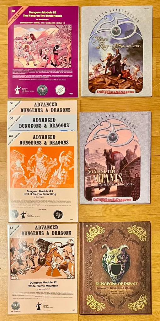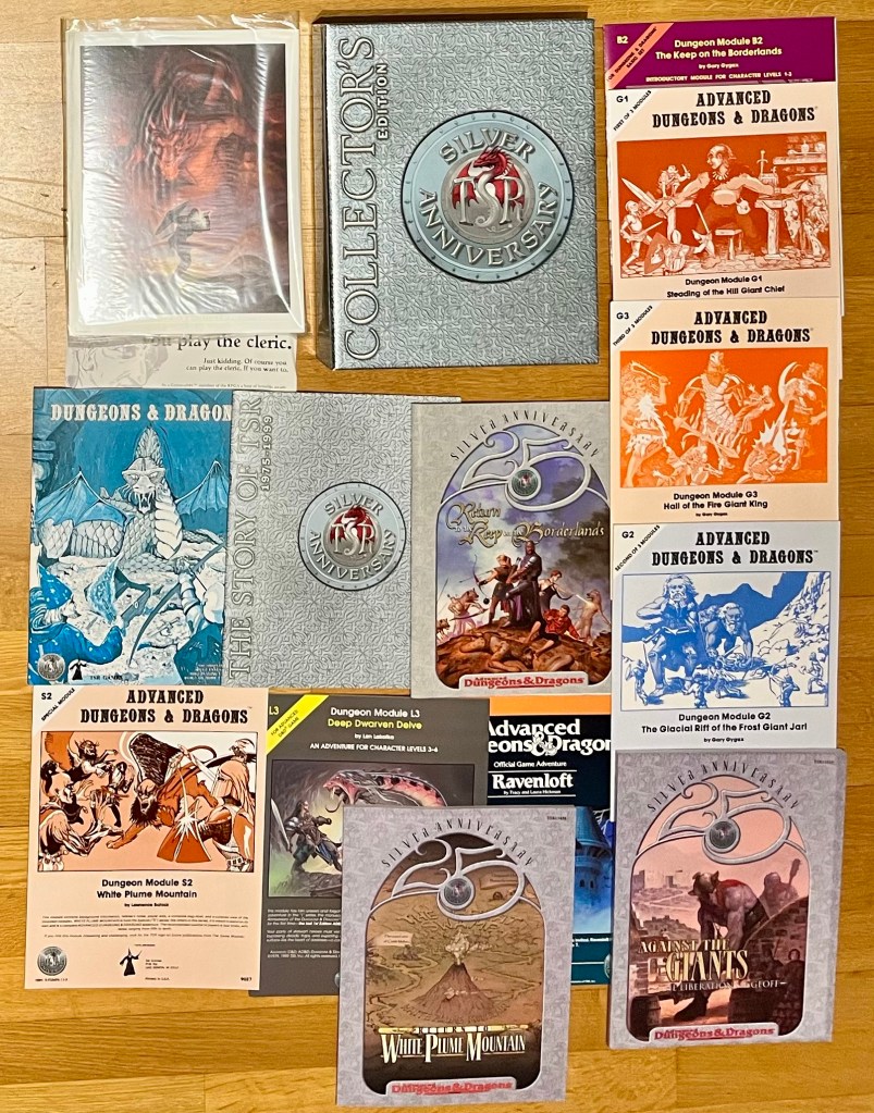 Einige der zum „Silver Anniversary“ 1999 erschienene Neuauflagen: Zuvorderst die große Silberbox oben in der Mitte, die jede Menge Facsimile-Nachdrucke klassischer Abenteuermodule und der 0e-Regeln von Ende der 70er lieferten. Die silbernen Bände mit der 25 auf dem Cover sind Neuinterpretationen klassischer Abenteuer (… die oftmals als Facsimile gleich daneben liegen).