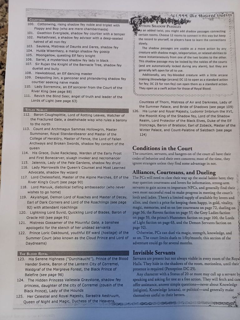 Ab hier begann das höfische Spiel am Palast. Es gab mehr als genug potentiell anspielbare NSC (siehe Galerie). Die Feen zeigten eine Hochkultur im Duellwesen, sodass Padrym sich alsbald mit einem hochrangigen Adligen duellieren musste und den Kampf gegen das flinke Feenwesen gewann. Der Charme der Feenwesen zeigte sich auch bei den Tänzerinnen und Musikanten. Niemand schien die Anwesenheit der Helden zu hinterfragen, sie wurden als Höflinge der „Königin von Sommer und Winter“ anerkannt. Doch Ambrosia war nicht am Hofe anwesend, nähere Informationen hierzu konnten die Helden nicht erlangen.