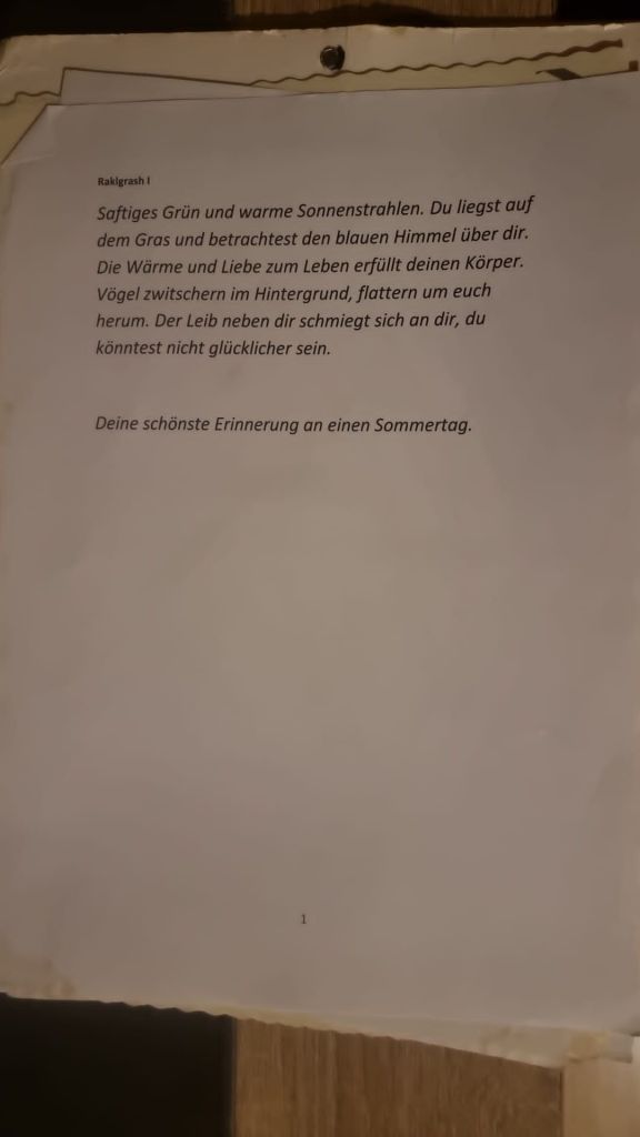 Im Verlauf der Handlung erhielt der Spieler immer wieder Handouts, welche diese Visionen schilderten. Leider hat nur Handout Nr. 1 die Zeit überdauert. Ich bin mir recht sicher dass es insgesamt drei oder vier waren. Inhalt der Visionen waren von verschiedener Natur. So wurde auch die Erste Welt und das Leben dort beschrieben. Raklgrash erhielt Eindrücke von dort, als sei er selbst anwesend gewesen.